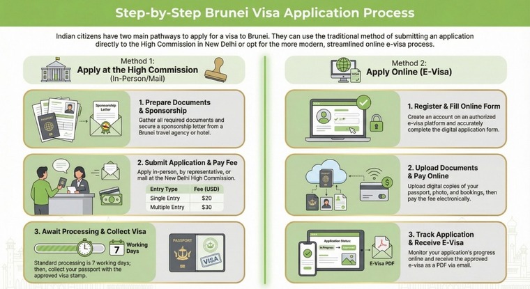 Method 1: Apply Through High Commission of Brunei in New DelhiGather all required documents as per the checklist above. Ensure everything is complete to avoid delays.