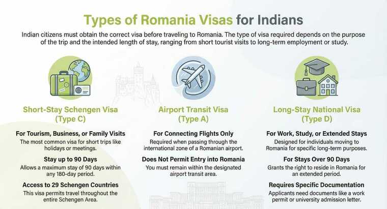 Indian citizens can apply for different types of Romanian visas depending on their purpose of travel and intended duration of stay.