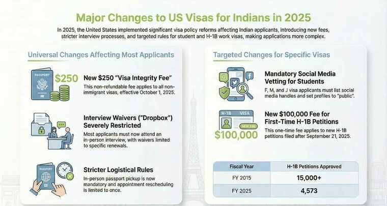 Are you planning to travel to the United States in 2025 or 2026? Indian citizens face significant changes in US visa policies, fees, and procedures this year. From the new $250 Visa Integrity Fee to stricter interview requirements and the controversial $100,000 H-1B fee, understanding these updates is crucial for your successful visa application.